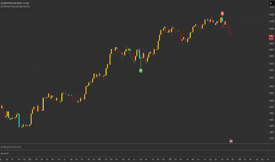 This indicator automatically detects Head and Shoulders (Bearish) and Inverse Head and Shoulders (Bullish) patterns using a smart ZigZag algorithm. Unlike standard indicators, it does not just mark the pivots; it draws the complete geometric "M" or "W" shape, including all legs from start to finish.