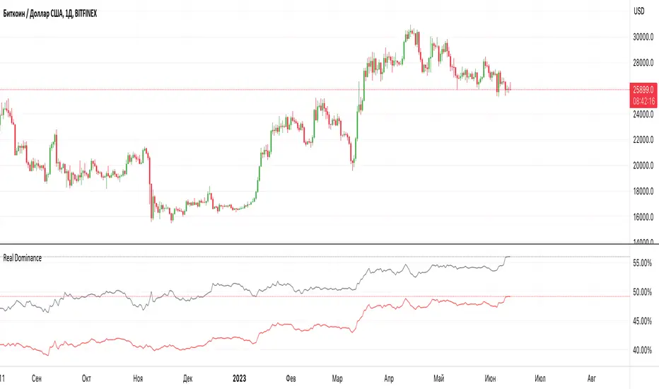 Indicator shows dominance of main coin (BTC by default) after deduction of all stablecoins marketcaps and compares it to dominance that provides TradingView (BTC.D by default). The reason of writing this indicator is to deduct all stablecoins' caps from bitcoin dominance and show dominance without impact of other stablecoins. It means, that if crypto cap equals to, let's say 100, stablecoins' cap will be part of it (something between 10 and 20), but generally stablecoins are not crypto and it's caps are generally not limited, so we can't clearly see what is real dominance of BTC in compare with altcoins.