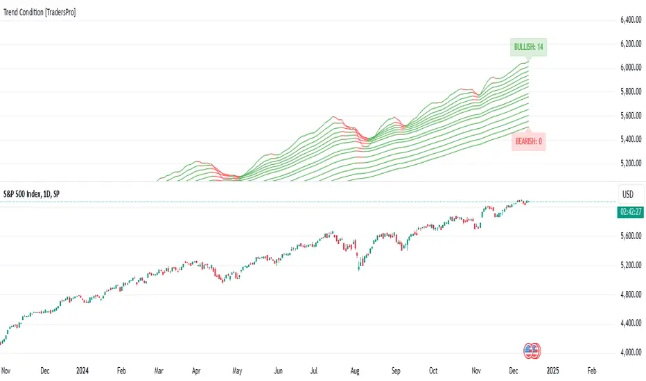 OVERVIEWThe trend condition indicator is designed to provide traders with a clear visualization of price trends using a multi-layer Exponential Moving Average (EMA) Ribbon. It dynamically displays whether the EMAs are trending bullish or bearish, alongside a real-time count of the number of bullish and bearish EMAs.