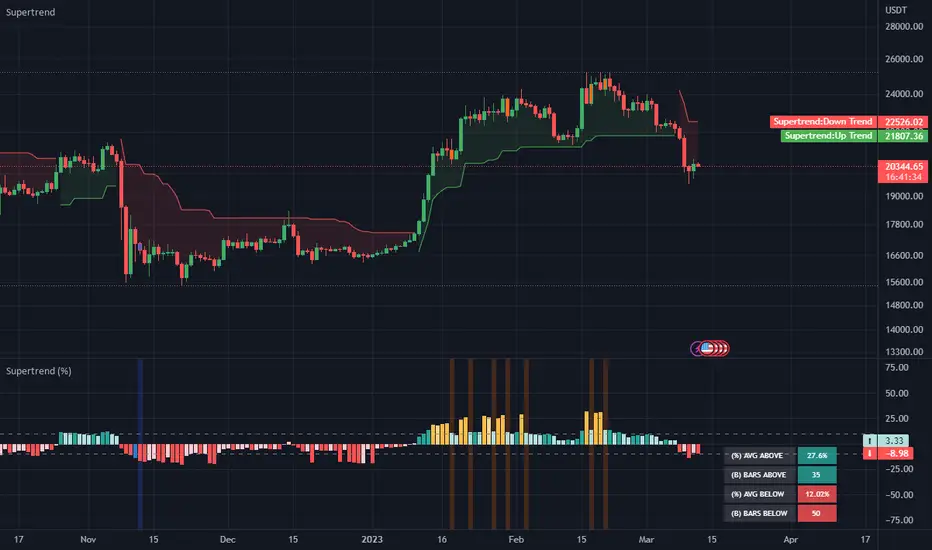 This indicator was created primarily as an experiment. While the supertrend can be powerful, in many cases, the trend has already started before the time it's identified, resulting in a price decrease. After conducting my own research, I discovered that the reversal point is often more nearby during the downtrend, rather than at the beginning of the uptrend. Surprisingly, this point is always based on the average percentage below or above the supertrend. The indicator calculates these averages, usually starting below the uptrend point, and in most cases, the trend continues upward from there.