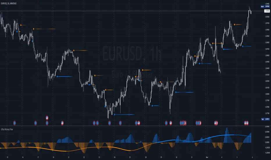 The Ultra Money Flow script is a technical indicator for analyzing stock trends. It highlights buying and selling power, helping you identify bullish (rising) or bearish (falling) market trends.