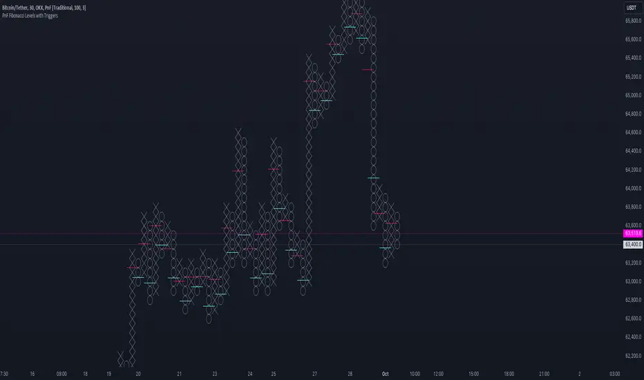 My Pine Script indicator, "PnF Fibonacci Levels with Alerts," overlays on a trading chart to generate alerts based on Fibonacci levels in Point and Figure (PnF) charts.