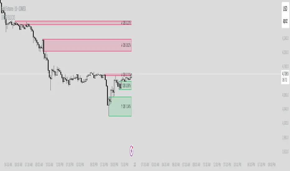 - Custom colors for bullish/bearish OBs and text labels showing candle range (%).