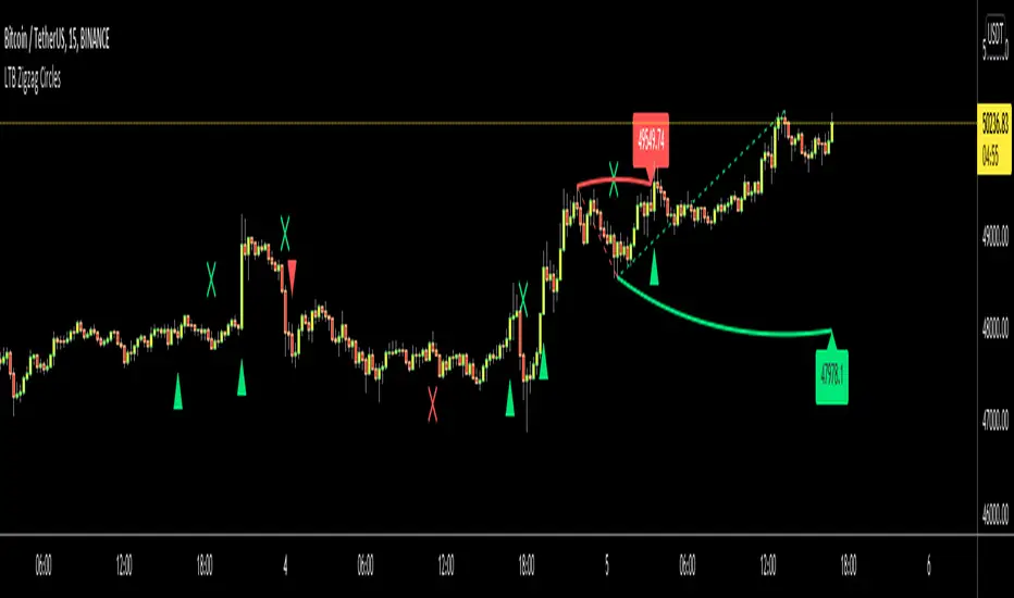 Today I am here with a new idea and script, "LTB Zigzag Circles". The idea is to create Circles using last 2 zigzag waves and to catch the breakouts earlier than horizontal lines. if a circle is broken then the script shows entry for Long/Short positions. and if broken circle reappears again then the position is closed. You can change Zigzag period as you wish and see the different results.