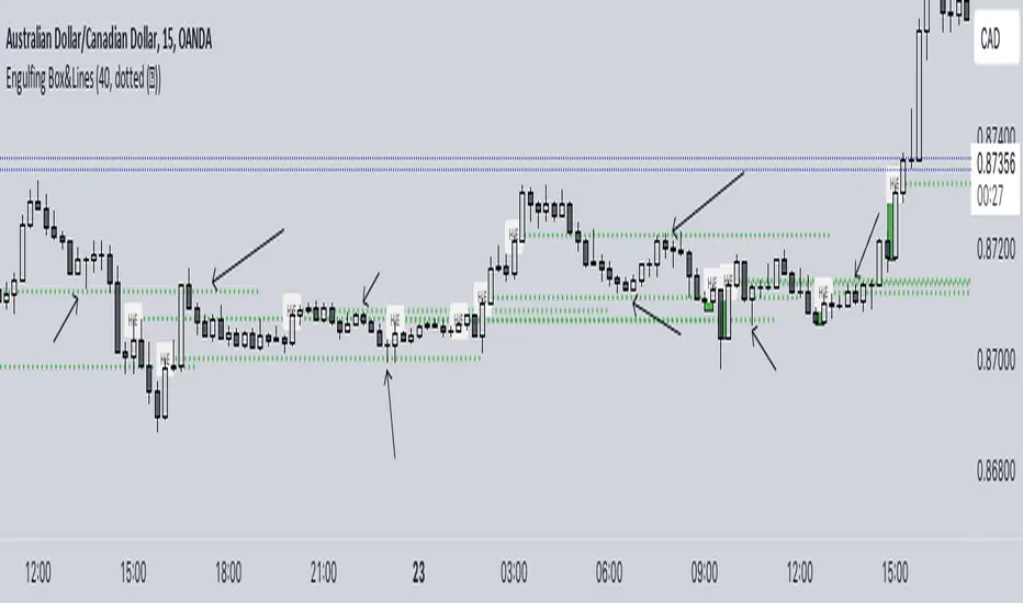 The "Engulfing Box & Lines" indicator aims to spot and highlight Engulfing candlestick patterns within a trend. These patterns can provide valuable indications of a possible trend reversal, and the indicator underlines them through the use of colored rectangles and horizontal lines. To fully understand the functioning and use of this indicator, let's explore its key elements and associated strategies.