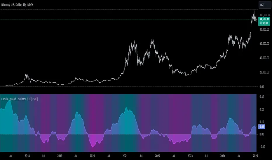The Candle Spread Oscillator (CSO) is a custom technical indicator designed to help traders identify momentum and directional strength in the market by analyzing the relationship between the candle body spread and the total candle range. This oscillator provides traders with a visually intuitive representation of price action dynamics and highlights key transitions between positive and negative momentum.