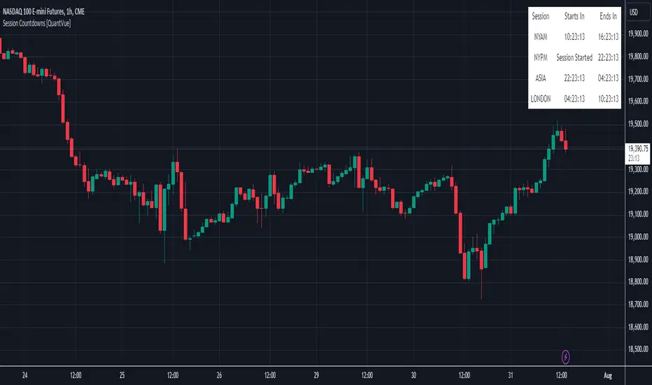 The Session Countdowns indicator is a powerful tool designed for traders who want to keep track of multiple trading sessions throughout the day. This indicator allows users to customize and monitor up to four different trading sessions with real-time countdowns until the session starts and ends.