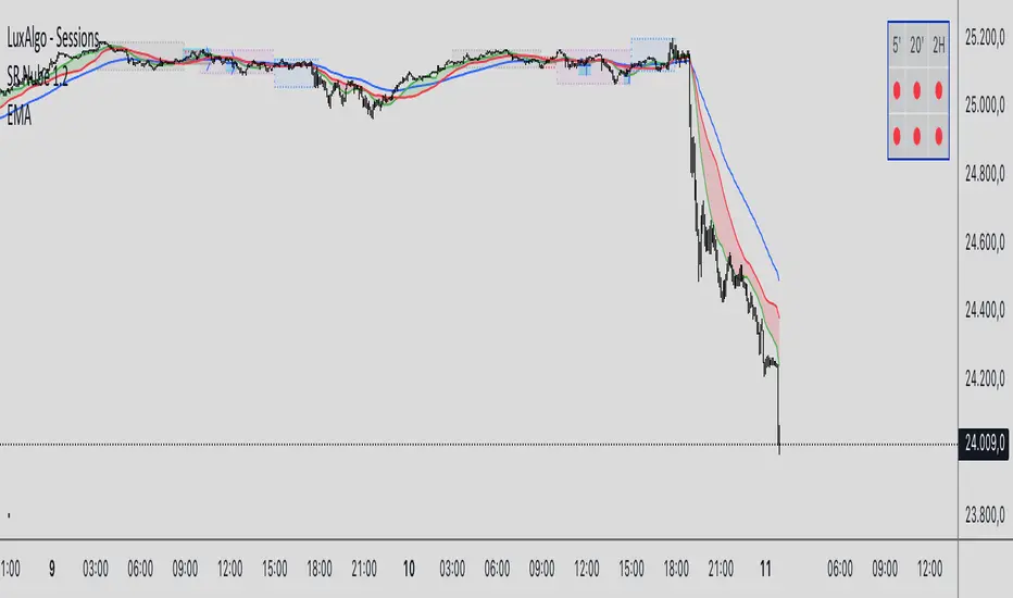 The SR Nube 1.1 indicator offers a comprehensive perspective on price action through the strategic combination of three key elements: a dynamic cloud based on two Volume Weighted Moving Averages (VWMA), a consistent reference Exponential Moving Average (EMA) across all timeframes, and an intuitive information table.The Dynamic Cloud: This cloud is calculated using two VWMA with lengths that automatically adjust based on the chart's timeframe. This dynamic adaptation allows for the identification of relevant support and resistance zones across different timeframes, providing contextual insight into potential price movement. The cloud visualizes areas of volume confluence, helping traders pinpoint zones where buying or selling pressure may be significant.