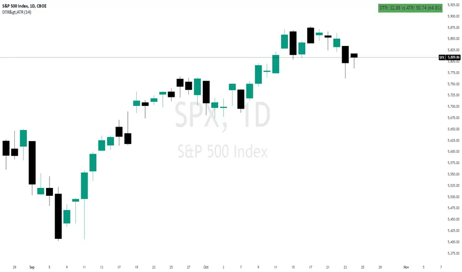 - Volatility Comparison: Visualize how the current day’s price range (DTR) relates to the average range (ATR) over a specified period.