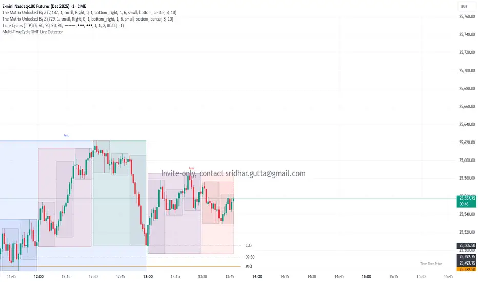 This indicator is a multi-asset, multi-timeframe SMT Live detector designed to work on any symbol (indices, futures, FX, crypto, stocks).