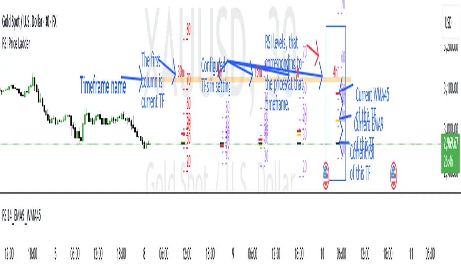 RSI Price Ladder is an indicator that visualizes RSI levels mapped directly to price levels across multiple timeframes.