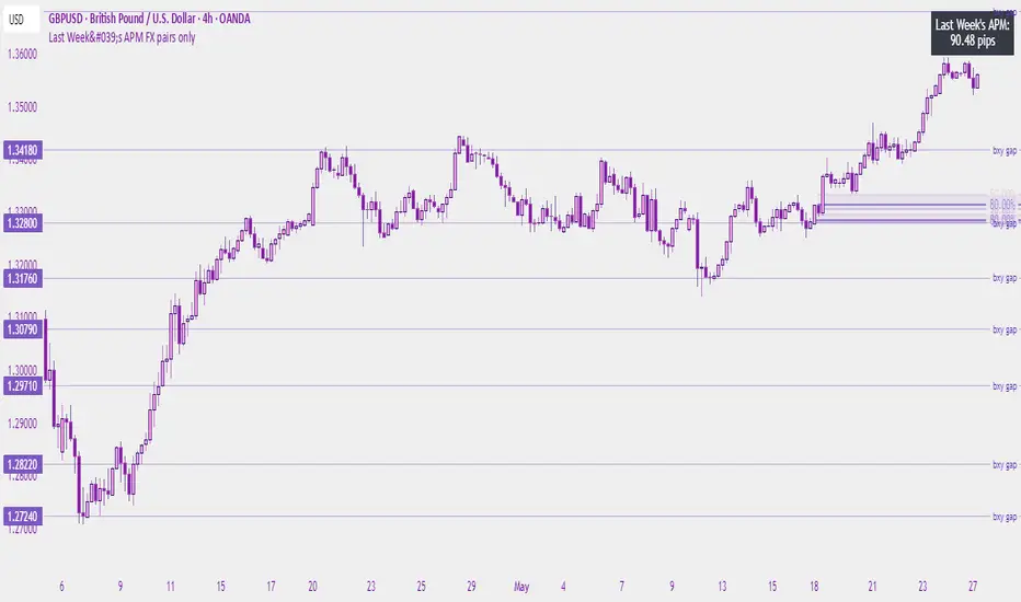 This script is designed for precision-focused forex traders who understand the power of volatility measurement. It calculates the Average Price Movement (APM) from the previous week by measuring the full wick-to-wick range (high to low) of each daily candle from Monday to Friday, then averaging them across the five sessions.