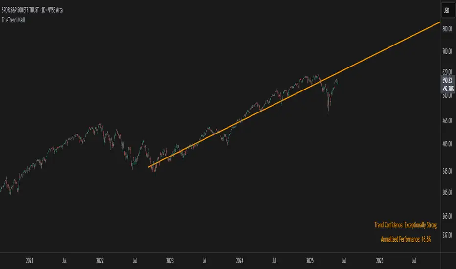 The TrueTrend MaxR indicator is designed to identify the most consistent exponential price trend over extended periods. It uses statistical analysis on log-transformed prices to find the trendline that best fits historical price action, and highlights the most frequently tested or traded level within that trend channel.