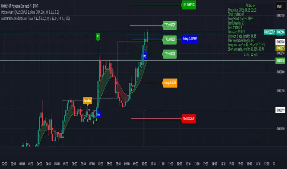 "Another EMA Trend Indicator" is a dynamic trend-following tool. Blending customizable Moving Averages (EMA or SMA) with an automated, visualized trade management system. It identifies bullish and bearish trend shifts based on short- and long-term MA crossovers, dynamically calculates optimal entry points, stop-losses, and take-profits, and visually manages trades on the chart with optional clouds, lines, and labels.