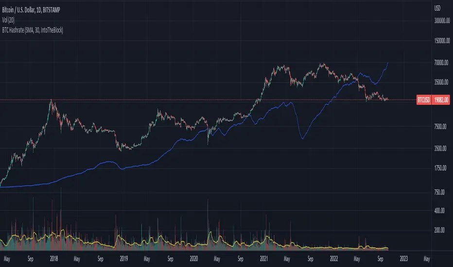 Script updated to have a selectable data source, options: IntoTheBlock, Glassnode. Default: IntoTheBlock.Script will now overlay the Hashrate curve over the chart by default instead of creating a new panel.