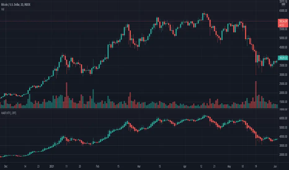 Higher TimeFrame using custom source function for toggling traditional Candle sources or Heikin-Ashi sources on a traditional Candles chart.