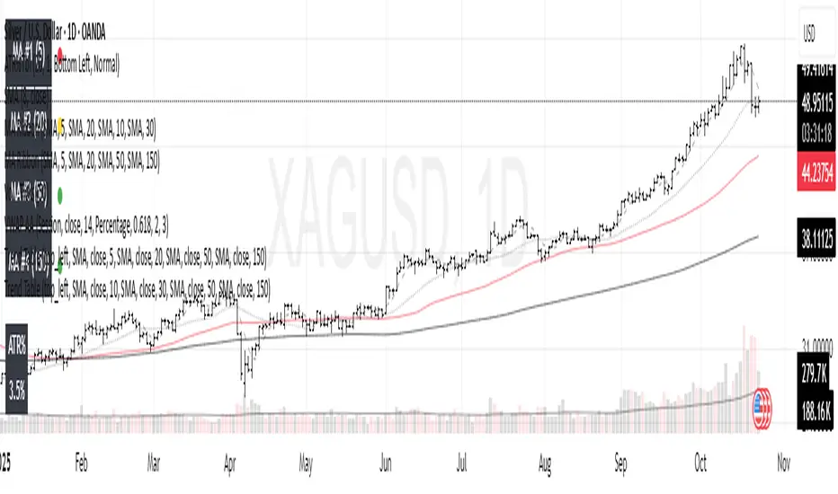 Instead of plotting moving average lines, this indicator displays a compact on-chart table showing each selected MA and its corresponding trend status using color-coded circles.