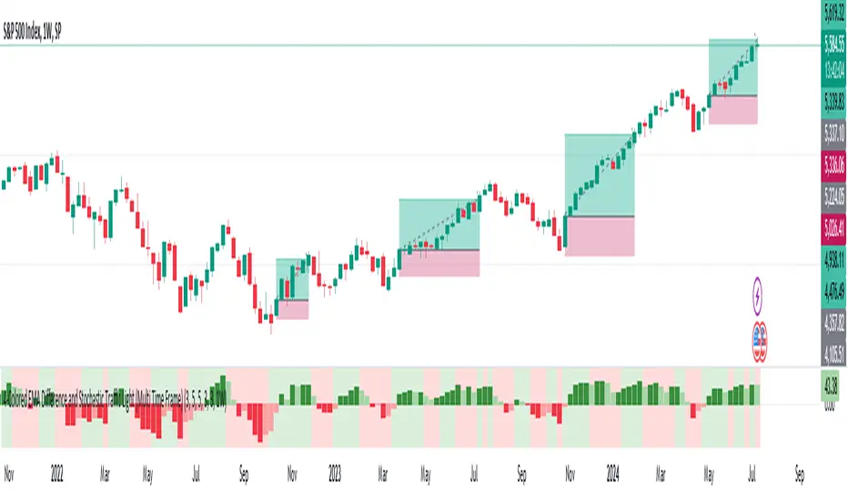 This indicator combines two popular technical analysis tools: the Exponential Moving Average (EMA) and the Stochastic Oscillator, with the added flexibility of analyzing them across multiple time frames. It visually represents the difference between two EMAs and the crossover signals from the Stochastic Oscillator, providing a comprehensive view of the market conditions.