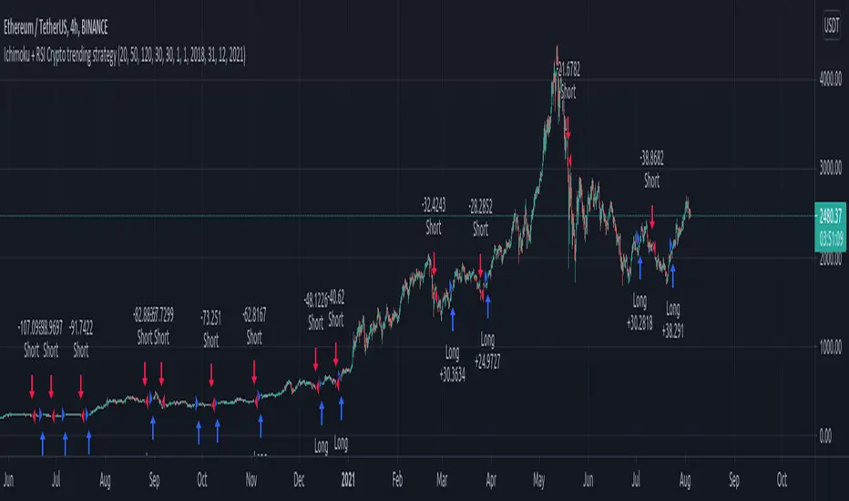 For long : we have a long cross condition on ichimoku and price is above the ichimoku lines, and at the same time RSI value is > 50.