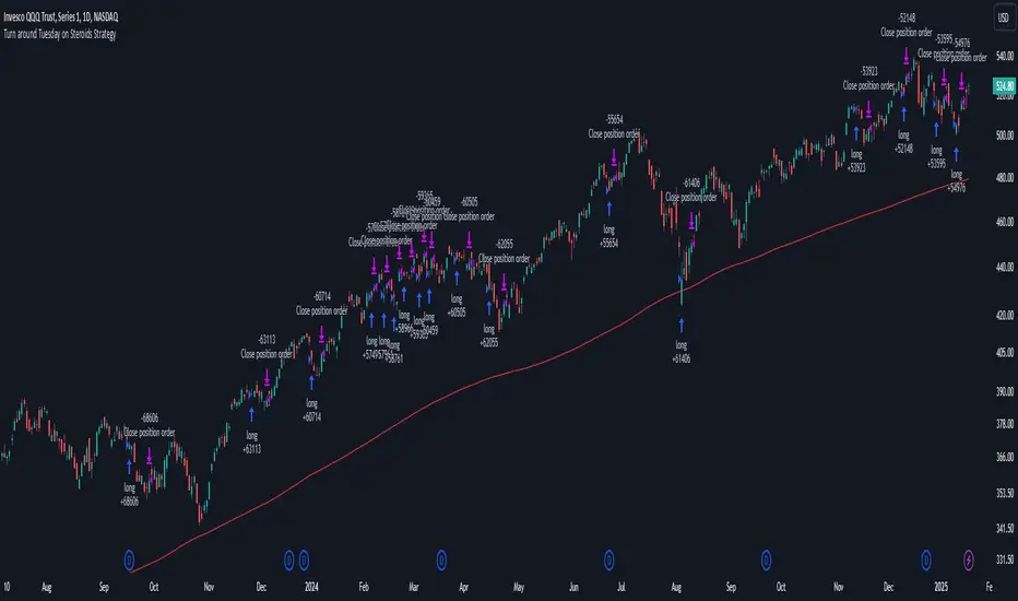 The "Turn around Tuesday on Steroids Strategy" is a mean-reversion strategy designed to identify potential price reversals at the start of the trading week. It enters a long position when specific conditions are met and exits when the price shows strength by exceeding the previous bar's high. This strategy is optimized for ETFs, stocks, and other instruments on the daily timeframe.