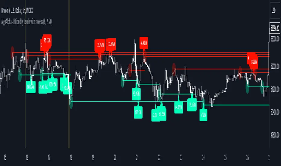 🌊📈 Dive into the depths of market liquidity with "Liquidation Levels with Liquidity Sweeps/Breakouts" - your ultimate tool for navigating the turbulent waters of trading! 🧹💹 Crafted by the wizards at AlgoAlpha, this Pine Script™ masterpiece illuminates the unseen liquidity levels and sweeps, guiding you through the financial seas with insight. 🚀🔍