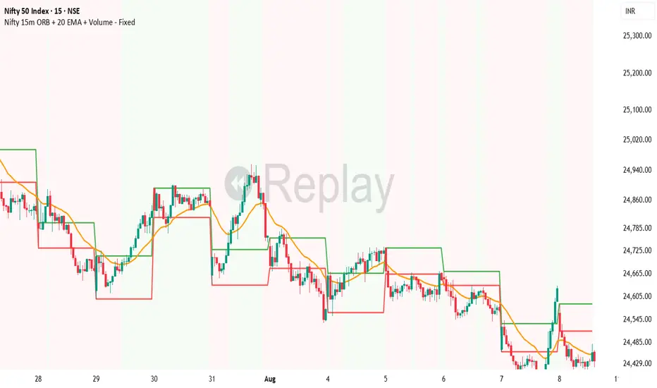 strategy("Nifty 15m ORB + 20 EMA + Volume - Signals Fixed", overlay=true,