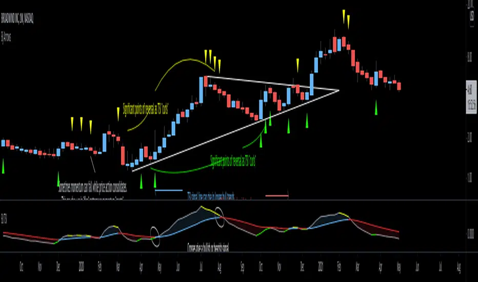 -Crosses of the TSI value line and signal line are a bullish or bearish indication. TSI value line is colored green or yellow to help identify that the TSI value line is either dropping or rising, while over or under the signal line.