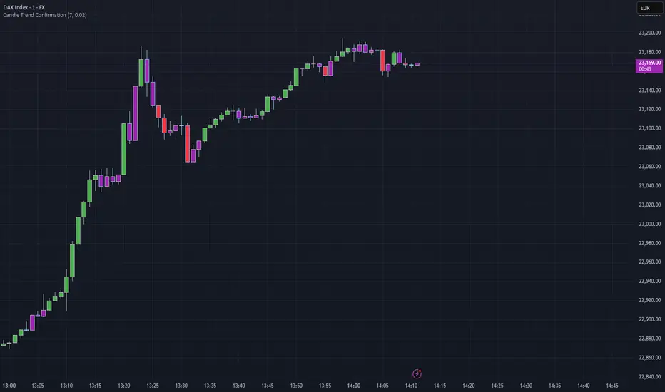 The "Candle Trend Confirmation" indicator This indicator leverages an Exponential Moving Average (EMA) to visually confirm market trends through dynamic coloring of the EMA line, a shading effect, and candle color changes. It aims to help traders quickly identify strong trends and consolidation phases, enhancing decision-making in various market conditions.