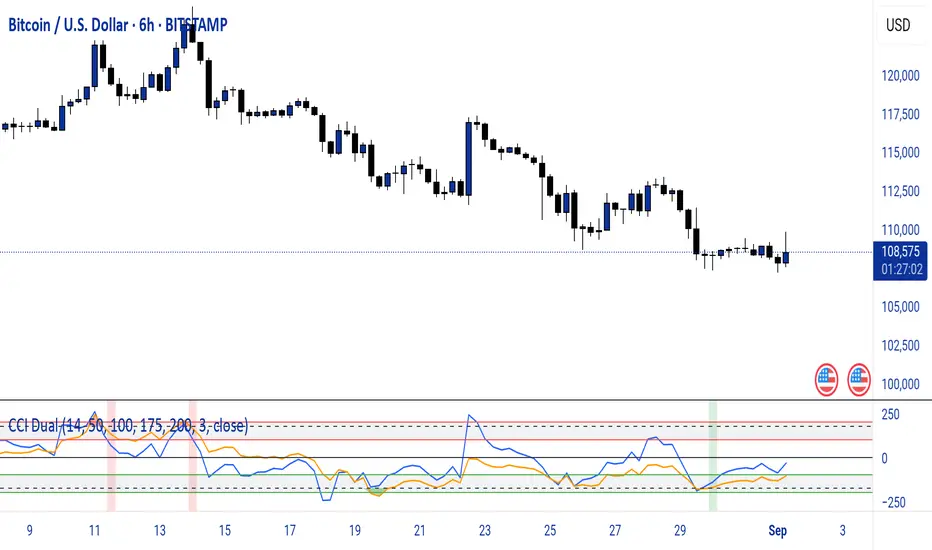 The CCI Dual is a custom TradingView indicator built in Pine Script v5, designed to help traders identify potential buy and sell signals using two Commodity Channel Index (CCI) oscillators. It combines a shorter-period CCI (default: 14) for quick momentum detection with a longer-period CCI (default: 50) for confirmation, focusing on mean-reversion opportunities in overbought or oversold conditions.