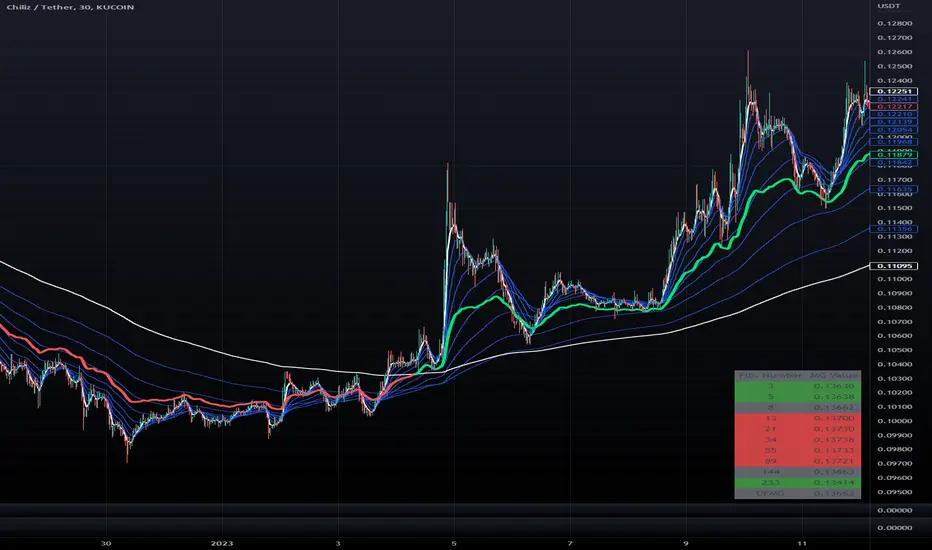 The FibMG lengths of 3 and 233 are plotted in white by default, the FibMGs with lengths between 3 and 233 are plotted in blue by default, and the democratic line (DFMG) that averages these lines is plotted in green or red depending on if the value is above or below the 233-length FibMG.