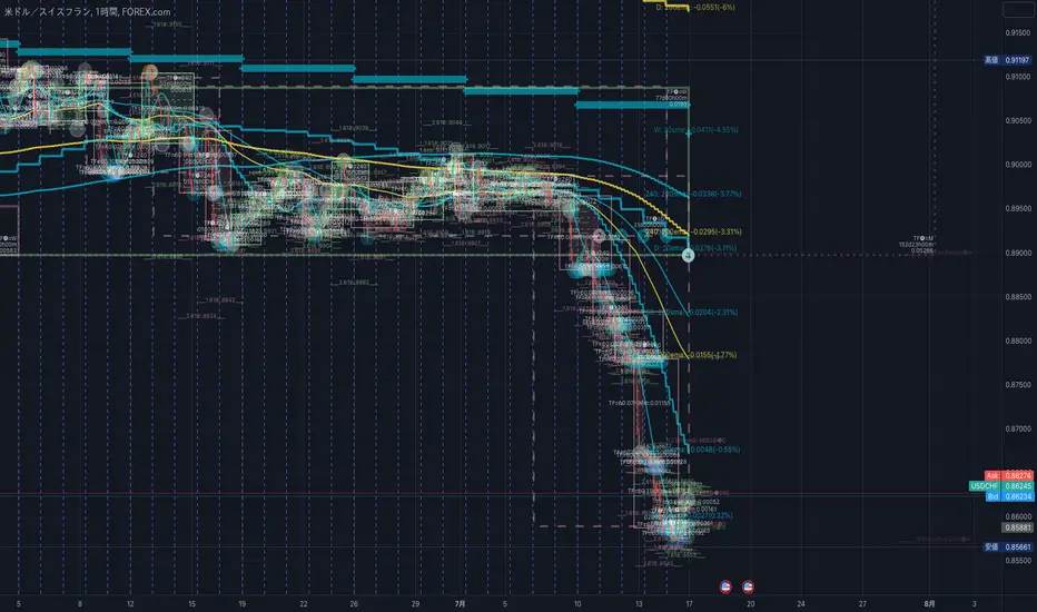 RSI Signal is color coded by RSI9 and RSI14 in each timeframe.(current TF: ●, HTF1-4: ➊➋➌➍)