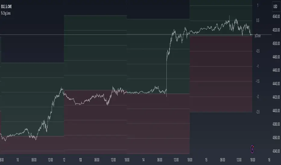 1. Percentage Change Lines: The core function of the script is to apply lines to the chart that represent specific percentage changes from the previous day's closing price. It can display up to five different percentage levels, ranging from 0.50% to 2.50% by default but the user can set any value that they wish. This feature allows users to quickly gauge how the current price is performing relative to the previous day's close.