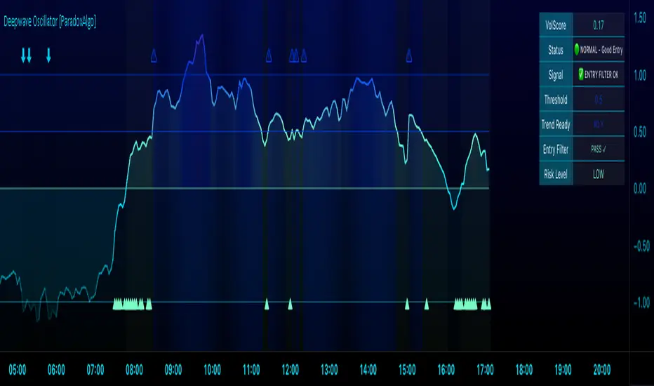Paradox Deepwave integrates these layers of volatility into a volatility scoring system. This composite score is built by normalizing various volatility inputs into a single, easy-to-read oscillator. The score dynamically adjusts as volatility in the market shifts, providing a color-coded visual output that helps traders quickly interpret the current volatility level.