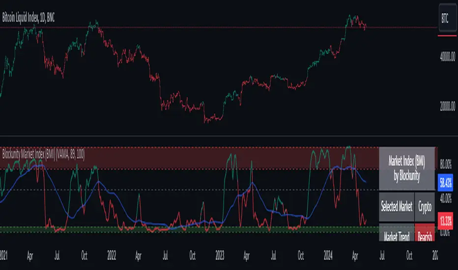 This indicator takes into account the state of 40 major Crypto, NASDAQ, SP500 or CAC40 market assets, depending on your choice in its parameters. It gives you the trend and strength of the market in the form of an index and a ratio. The oscillator’s high and low limits also help identify potential oversold or overbought zones.