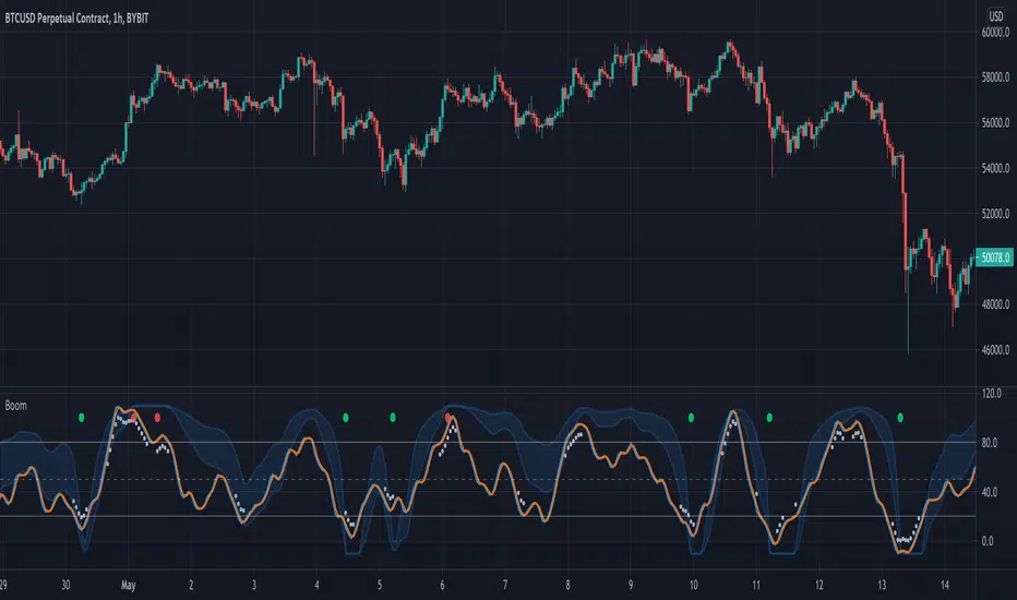 Every "boom" begins with a pullback... This indicator will help traders find bottoms and perfect entries into a pump. It combines two indicators, Dr. John Ehlers Early Onset Trend (EOT) and the infamous Stochastic RSI. The indicator features a built in dump and dip detector which usually picks up signals a few candles before it happens. The blue wave (EOT) shows trend, when waves travel up so does the price. Likewise for the opposite. Low points are revealed when EOT bottoms out and flat lines. Traders can then use the Stochastic RSI crossover to enter a trade. As the EOT lines get closer together there is more movement in price action, so as they get wider traders can expect sideways action. This indicator works on all timeframes but has had excellent results on hourly chart.