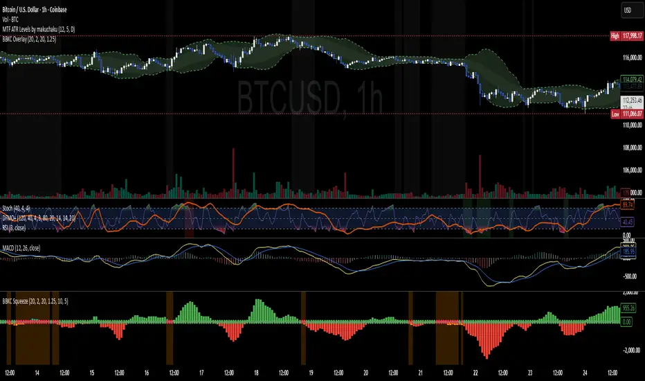 BBKC Combined Channels Overlay (Volatility & Mean Reversion)This indicator provides a clean, single-view envelope combining the Bollinger Bands (BB) and Keltner Channels (KC) directly onto your price chart. It is an essential tool for traders operating with Volatility Compression (The Squeeze) and Mean Reversion strategies in fast-moving markets like Futures, High BTC Beta Equities, and Crypto. The goal of this tool is twofold: to visually frame the market's current volatility state and to identify high-probability entry points based on expansion or extreme contraction. How to Use the BBKC Overlay: Spotting the Squeeze (Accumulation Phase):The Squeeze is identified when the Bollinger Bands (BB) contract and fit inside the Keltner Channels (KC).The area is clearly marked with a subtle Orange Background Highlight on the main chart. This is the Accumulation phase, signaling low volatility before a potential large directional move. Trading Mean Reversion: When price pushes aggressively outside the outermost bands (the BB Upper/Lower), it signals an extreme volatility expansion and over-extension. This is a strong setup for mean reversion—a high-probability trade targeting a snap-back towards the central Basis Line (SMA).Customizing for Extreme Compression: For traders looking only for the tightest, highest-probability Squeezes, adjust the following setting: KC Multiplier (ATR): Lower this value from the default of 1.5 down to 1.25 or 1.0. This narrows the KC, forcing the Bollinger Bands to contract even further to trigger the Squeeze signal, thus filtering for only the most minimal volatility. Recommended Synergy: For a complete volatility system, pair this BBKC Combined Channels Overlay (your visualization tool) with the BBKC Squeeze Indicator (the sub-pane momentum histogram).Overlay (Main Chart): Shows where the Squeeze is occurring and identifies mean reversion targets. Squeeze Indicator (Lower Pane): Shows if the Squeeze is active and the directional momentum building up, helping you time the breakout entry for the Manipulation/Distribution phase.