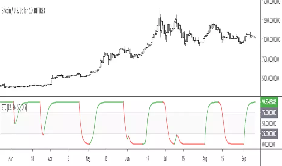 The Schaff Trend Cycle indicator is the product of combining Slow Stochastics and the moving average convergence/divergence (MACD). The MACD has a reputation as a trend indicator, but it's also notorious for lagging due to its slow responsive signal line. The improved signal line gives the STC its relevance as an early warning sign to detect currency trends.
