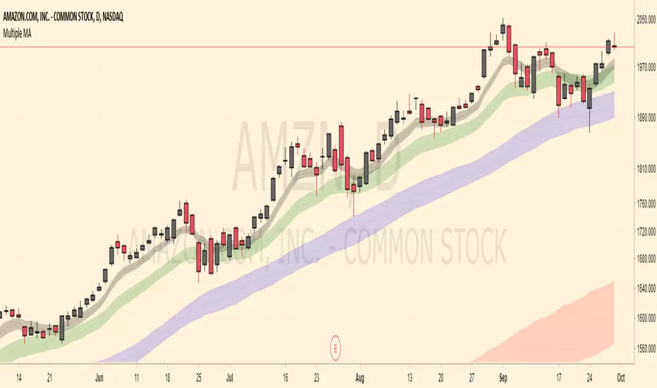 Common moving addresses often act as support and resistance levels. This script will incorporate four (2 exponential and 2 simple ) moving averages. The default are lengths of 8, 20, 50, and 200. These are adjustable. Many of us are aware that these areas often tend to be supply / demands zones. We are also aware that movement around these areas can fluctuate greatly so I've included ATR-based bands around the moving averages hoping to visualize these moving averages in a less rigid and more realistic way. Feel free to modify this script as you please. Constructive feedback is always appreciated.