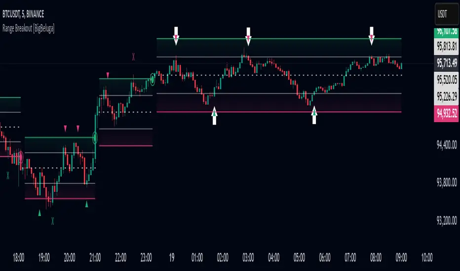 Range Breakout [BigBeluga] is a dynamic channel-based indicator designed to identify breakout opportunities and price reactions within defined ranges. It automatically creates upper and lower bands with a midline, helping traders spot breakout zones, retests, and potential fakeouts.