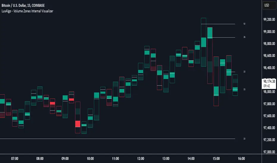 The Volume Zones Internal Visualizer is an alternate candle type intended to reveal lower timeframe volume activity while on a higher timeframe chart.