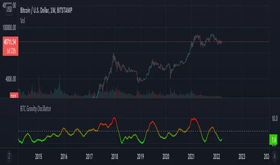 This indicator is a deviation of a Center of Gravity Oscillator corrected for the diminishing returns of Bitcoin.