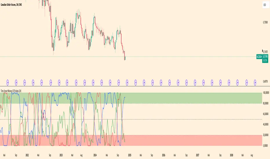 The **Tims Smart Money COT Index** analyzes the positions of different groups of market participants from the COT report (Commercials, Large Specs, Small Specs). It calculates their net positions and scales them relative to extremes of the last 24 weeks. It indicates bullish and bearish zones to identify market sentiments.