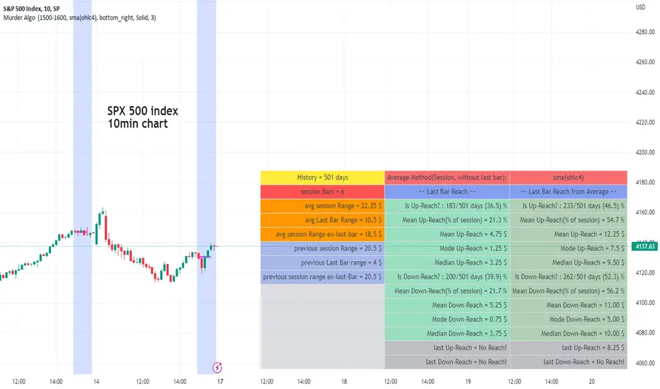 -Should also work on custom user-defined session; though this indicator was explicly designed to investigate the 'murder algo': that final rush and/or whipsaw tendency of price in the last few minutes of Regular trading on Indices.