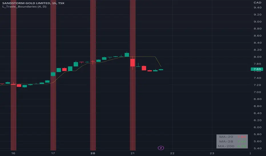 Trade Boundaries suggest a strength of the security with respect to previous lows. The "L" implies library, and the trade boundaries implies it could be utilized for price strengths. Though, this should not be used as a single parameter to trade wildly. This library can be imported to a custom indicator to utilized the custom functions. There are moving averages attached at the bottom right of the canvas (overlay) to benchmark the closing price with respect to Moving Averages: 20, 28, and 200 (i.e., "D" if timeframe == "D") respectively. The Volume Indicator located at the top of the canvas is a default function (function already made by the trading view) this shows the volume with respect to the selected time frame. All of the indicators tell a story with regard to the security price (in strength terms).
