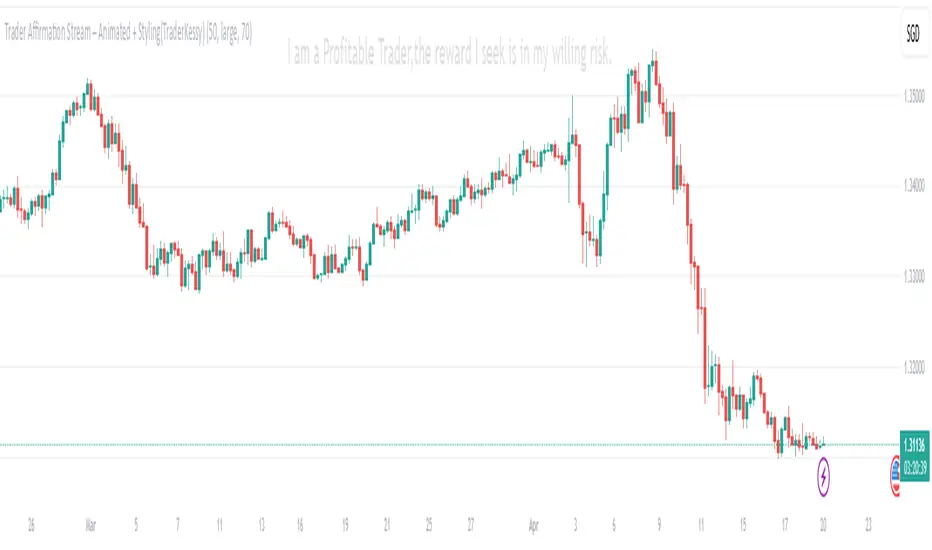 The Trader Affirmation Stream is a minimalist overlay indicator designed to keep you focused, motivated, and mentally sharp during your trading sessions. It displays a rotating series of positive trading affirmations—gently animated with a fading effect—right on your chart to help reinforce discipline, patience, and consistency.