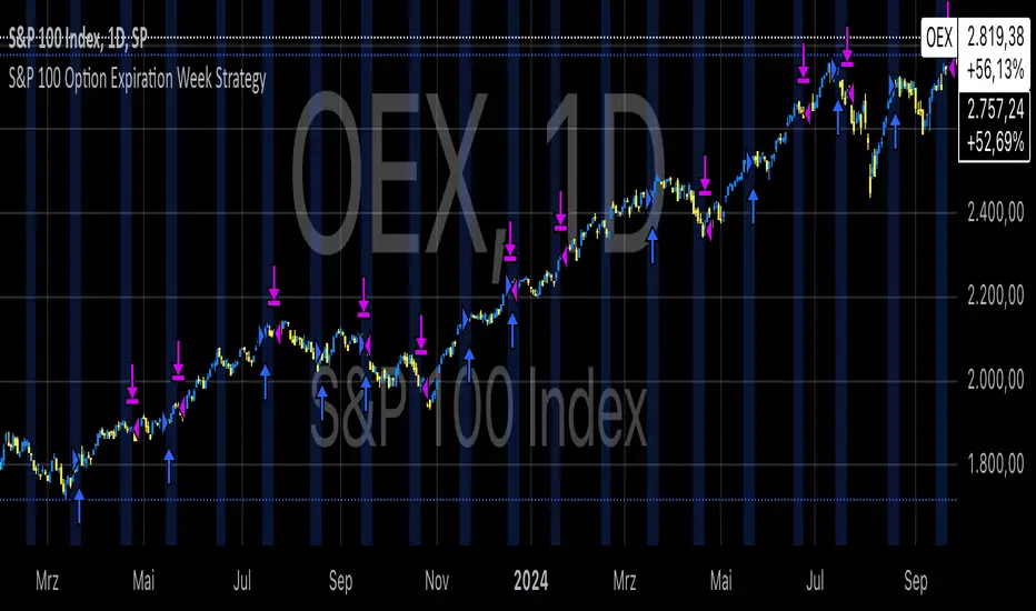 The Option Expiration Week Strategy aims to capitalize on increased volatility and trading volume that often occur during the week leading up to the expiration of options on stocks in the S&P 100 index. This period, known as the option expiration week, culminates on the third Friday of each month when stock options typically expire in the U.S. During this week, investors in this strategy take a long position in S&P 100 stocks or an equivalent ETF from the Monday preceding the third Friday, holding until Friday. The strategy capitalizes on potential upward price pressures caused by increased option-related trading activity, rebalancing, and hedging practices.
