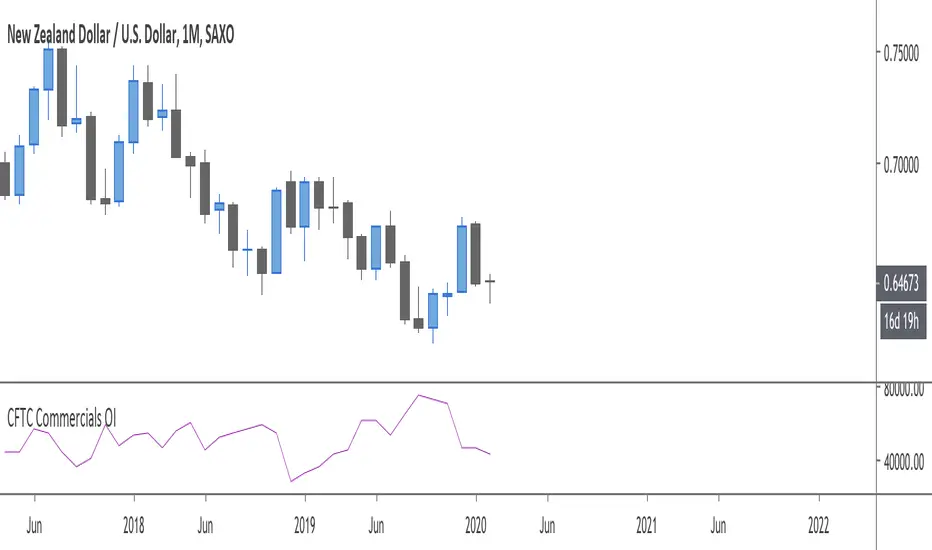 This is a very simplified script of Chris Moody’s original COT Commercials net position script, updated to Pine Script version 4. I stripped out just the Open Interest and it shows the weekly changes in Open Interest.