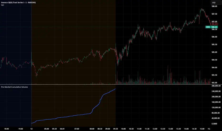 To use this script effectively, ensure extended‑hour data is enabled on the chart, and select an intraday timeframe where pre‑market data is available. The result is a simple yet powerful tool for monitoring cumulative pre‑market activity.