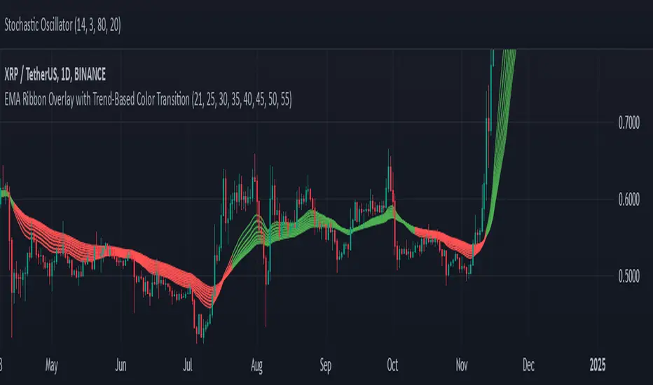 This indicator visualizes an EMA Ribbon with a trend-based color transition. It helps traders quickly identify market trends and transitions between bullish and bearish movements.