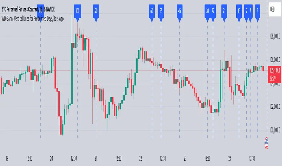 This Pine Script draws vertical lines on the chart at specific time intervals, inspired by WD Gann’s theories of time cycles. WD Gann, a famous trader, believed that market movements were influenced by predictable time cycles. This script enables traders to visualize these key time cycles on the chart by placing vertical lines at predefined intervals (in bars ago), helping to identify potential turning points in the market.